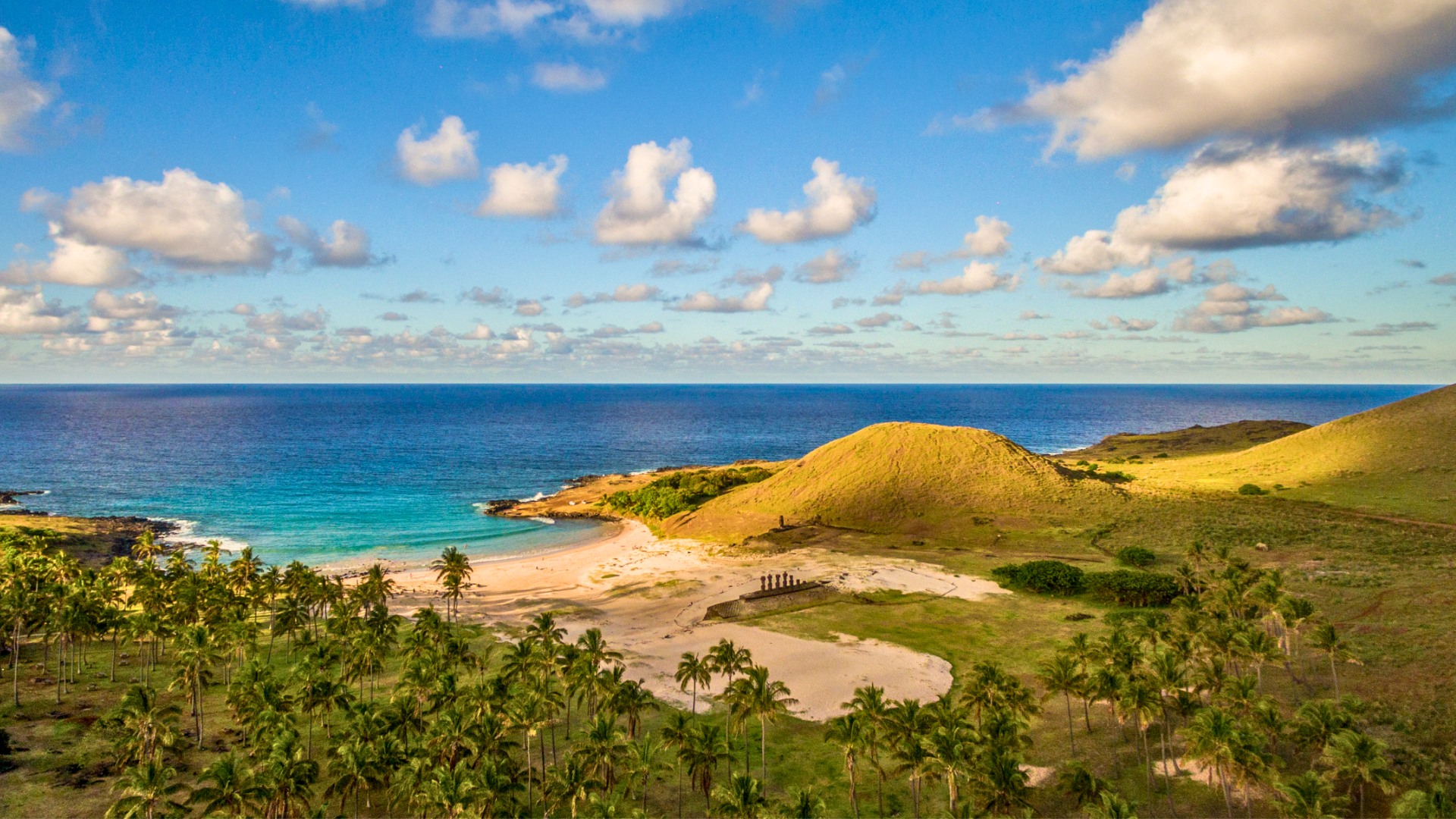 Anakena, la playa principal de la Isla de Pascua, representa la idea típica que todos tenemos en mente cuando pensamos en una playa paradisíaca. La arena blanca y fina de coral, el mar turquesa cristalino, las olas tranquilas y los cocoteros la convierten en un lugar ideal para el descanso.