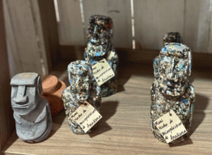 También llaman la atención las figuras de moai hechas con microplástico reciclado, una iniciativa que destaca el compromiso con el cuidado del medio ambiente en Rapa Nui.